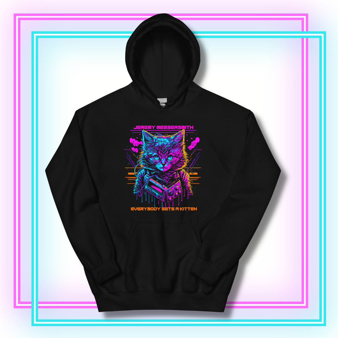 Everybody Gets a Kitten, retro style! This classic black unisex hoodie features a fun throwback neon design by jeremy messersmith.